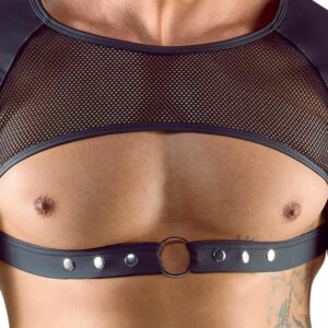 Schwarzes, brust- und bauchfreies Halbarm-Shirt von Svenjoyment im stylischen Mattlook mit transparentem Netz-Einsatz vorne. Rundum weich und elastisch für hohen Tragekomfort. Der maskuline Unterbrust-Riemen mit Frontring ist mit dekorativen Druckknöpfen passend verstellbar.