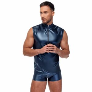 Blaues Shirt von NEK im trendigen Metallic-Mattlook. Ärmellos, eng und körperbetont geschnitten. Mit kleinem Stehkragen und silberfarbenem Reißverschluss vorne. Weich und elastisch für hervorragenden Tragekomfort.