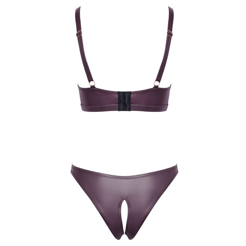 Softer BH und Slip ouvert im Set von Cottelli LINGERIE. Beides im lilafarbenen Wetlook – weich und elastisch für höchsten Tragekomfort. Raffinierte Schnittführung mit edlen roségoldfarbenen Ring-Accessoires. BH im Rücken mit verstellbarem Hakenverschluss. Auch die Träger sind für optimale Passform verstellbar. Der verführerische Slip ist im Schritt komplett offen.