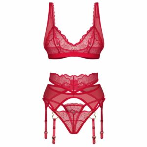 3-teiliges Set Cupide Desir von Obsessive mit BH, Strapsgürtel und String. Filigrane Spitzen-Optiken und Transparenzen in sinnlichem Rot mit goldfarbenen Details. Rundum weich und elastisch für hohen Tragekomfort. BH mit dezentem Schmuckdetail zwischen den soften Cups. Die Träger sind passend verstellbar. Strapsgürtel mit Schmuckherzen an den beiden vorderen Strapsen. Die Strumpfhalter sind ebenfalls passend verstellbar.