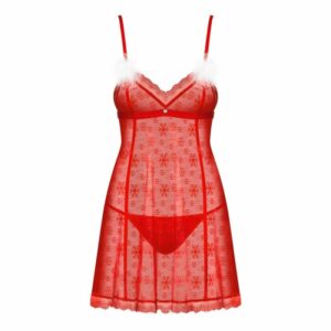 Rotes Dessous-Set Claussica von Obsessive bestehend aus Negligé und String. Feiner Stretchtüll im Schneeflocken-Design, weich und elastisch für hohen Tragekomfort. Negligé vorne an den Trägern mit weißen Plüschbommeln verziert. Hinten komplett offen mit BH-Hakenverschluss und Satin-Bindeschleife. Träger verstellbar. Zwischen den soften Cups mit kleinem Schmuckdetail.