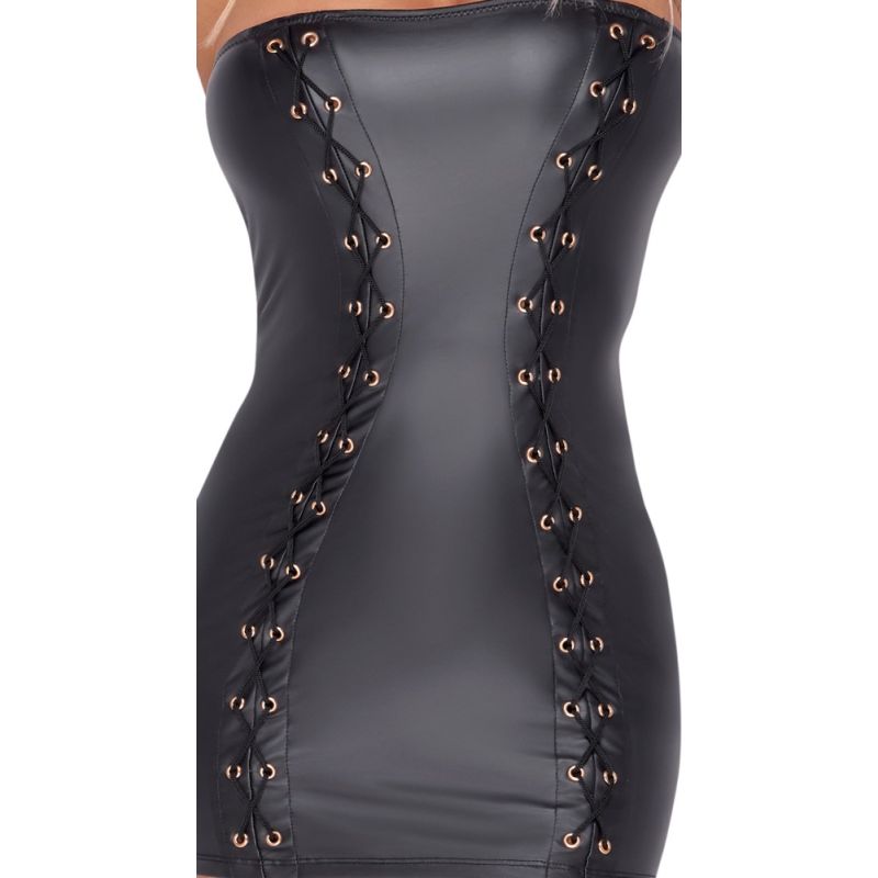 Kurzes trägerloses Tube-Kleid im edlen schwarzen Mattlook. Eng geschnitten und tailliert mit roségoldfarbenen Metall-Ösen für die 2 Zierschnürungen vorne in figurbetonender Sanduhr-Optik. Weich und hochelastisch für hohen Tragekomfort.