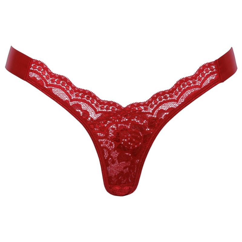 Liebesroter String von Cottelli LINGERIE aus weicher elastischer Spitze. Seitlich und hinten breite Satinbänder, die über dem Po zur großen Schleife gebunden werden – wie ein Geschenk!