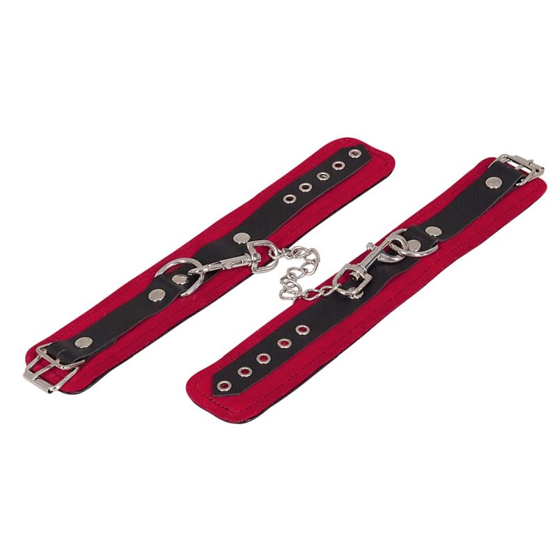 Zwei Fußfesseln aus rotem Veloursleder, mit schwarzem Glattleder weich gepolstert. Jeweils ca. 5,5 cm breit. Umfang mit Schnallenverschluss verstellbar. An den D-Ringen mit zwei Karabinerhaken abnehmbare, 10 cm lange Verbindungskette. Spaltleder/Metall.