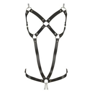 Schwarze Lederriemen, kombiniert mit stählernen Ringen, Metallketten-Trägern und zwei Metallketten im komplett offenen Schritt. Alle Riemen verstellbar für perfekte Passform.
