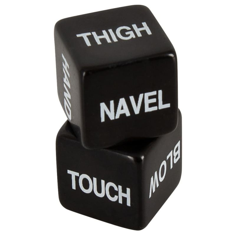 10 x 2 Liebeswürfel im Set in edler schwarzer Optik mit weiß aufgedruckten Begriffen auf Englisch. Ein Würfel benennt die auszuführende Aktion, der andere Würfel die Körperpartie – ein Wurf (und der Zufall) entscheidet, wie und wo am Körper des/der Partner:in stimuliert wird.