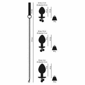 4-teiliges Butt Plug Set with a Leash von You2Toys mit 3 verschieden großen Plugs plus Kettenleine. Jeder Plug mit Anus schmückendem Stopper in Herzform, an dem 2 bimmelnde Glöckchen und ein Ring befestigt sind. An den Ring kann für Kontroll- und Führungsspiele die beiliegende Kettenleine mit dem Karabiner eingehängt werden. Kettenleine mit Handschlaufe in Lederoptik. Die Plugs aus Aluminium können für noch raffiniertere Empfindungen Im Wasserbad erwärmt oder im Kühlschrank abgekühlt werden.