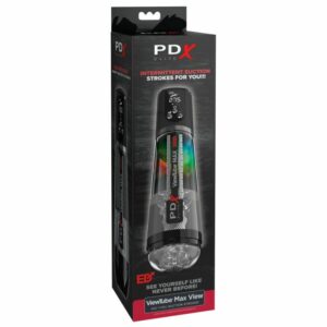 Transparenter Masturbator ViewTube MAX von PDX Elite in handlichem Klarsicht-Gehäuse mit Schutzkappe. Beste Sicht auf den Penis, wenn er beim Verwöhnen (und Anschwellen) von bunten Lichtern umflackert wird! Die intensiven Vibrationen und die kraftvolle intermittierende Saug-Funktion verwöhnen den Penis rundherum. Die Vibrationen und 4 automatisch variierende Saugmodi sind per Knopfdruck am LED-beleuchteten Bedienfeld getrennt steuerbar. Die Saugkraft (mbar) lässt sich auch manuell einstellen und ist am LED-Display gut kontrollierbar. In der ultraweichen Transparent-Sleeve wird der Penis zusätzlich von Rippen und Noppen intensiv massiert. Die Sleeve in neutraler Optik ist zur einfachen Reinigung herausnehmbar.
