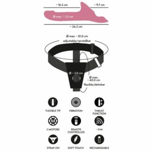 Der raffinierte Vibrator punktet mit seinen doppelmotorigen Vibrationen, die den aktiven und passiven Part zugleich verwöhnen. Dazu die automatische Stoßfunktion, die das Strap-on-Vergnügen kräftig und tiefgehend unterstützt. Der aktive Part genießt den anatomisch perfekt geformten Aufleger, der sich vibrierend an Vulva und Klitoris schmiegt. Der passive Part den immer wieder zustoßenden Vibrator-Schaft mit der strukturierten Eichel und den Reizrillen. 7 Vibrationsmodi und 3 Stoß-Intensitäten sind direkt am Toy oder – noch bequemer – mit der Fernbedienung getrennt steuerbar (Reichweite 8 m). Der Stoßvibrator ist leicht aus dem Umschnallstring herausnehmbar.