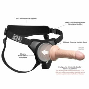 Das einfache Strap-on-System basiert auf der anatomisch gewölbten Andockplatte, in der jeder Saugfuß eines Dildos oder Vibrators (nicht beiliegend) fixiert/angedockt wird. Der Dildo/Vibrator wird in optimaler stoßfreudiger Position gehalten (Push & Play). Die Andockplatte verteilt den Druck gleichmäßig auf den Beckenbereich, sodass punktueller unangenehmer Druck vermieden wird. Bei dieser Elite Mini-Ausführung ist für noch höheren Komfort der Rückengurt weich gepolstert und die innen gepolsterte Andockplatte aus Silikon gefertigt. Sie passt sich der Anatomie und den Bewegungen perfekt an. Die stabilen Gurte sind für festen und komfortablen Sitz in der Passform mit Kunststoffgleitern verstellbar.