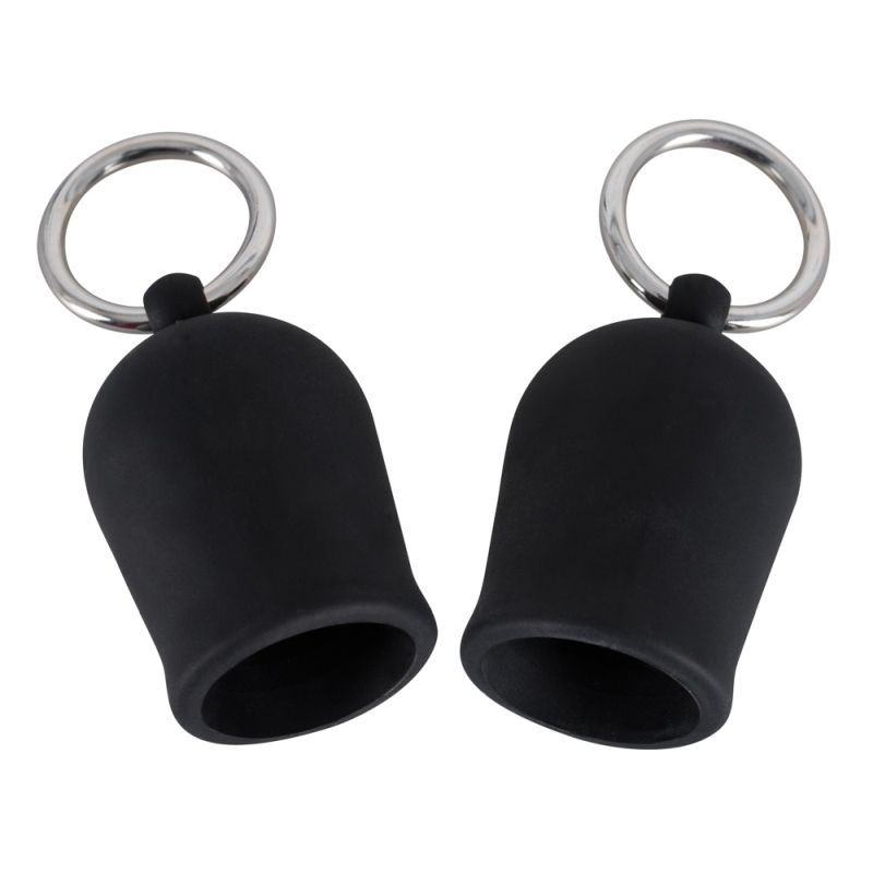 Zwei schwarze Nippelsauger mit Metallring. Die Sauger werden auf die Brustwarzen gesetzt, durch Zusammendrücken entsteht das saugende Vakuum. Innen-Ø 2,1 cm. Material: Silikon, Metall.