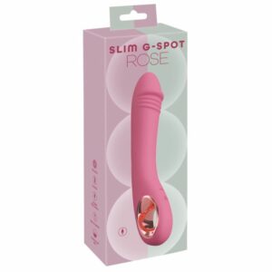 Eleganter handlicher Vibrator Slim G-Spot Rose von You2Toys für intensive Vagina-Massagen mit gezielter G-Zonen-Stimulation – allein oder zu zweit. Ideal gebogen und mit stilisierter strukturierter Eichel ausgestattet, verwöhnt er tiefgehend und G-punktgenau. Dabei verwöhnen 10 leise Vibrationsmodi von sanft bis intensiv. Bequem per Knopfdruck steuerbar am praktischen Ring-Griff, der auch sicheren Halt und komfortables Spiel gewährleistet. Sogar in Bad und Dusche, denn der Slim G-Spot Rose ist wasserdicht.