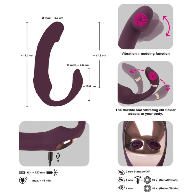 Die pochend-klopfenden Nickbewegungen der Eichelpitze sind im Takt mit den Vibrationen im Schaft kombiniert und in 10 Modi steuerbar. Auch die Vibrationen des Klitorisstimulators bieten mit 10 Modi viel Abwechslung bei der Dual-Stimulation. Die Funktionen in Schaft und Stimulator sind getrennt direkt am Toy steuerbar – ganz bequem per Knopfdruck. Der starke Motor sorgt dabei für zuverlässige Kraft und Energie.