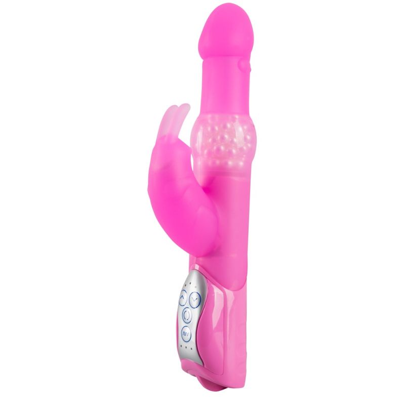 Silikon-Vibrator mit Klitoris-Vibro-Bunny und beweglichen Ohren. Die Links-Rechts-Rotation ist in jeweils 3 Stufen, die Vibration in 7 Stufen bequem per Knopfdruck regelbar. Pink. Gesamtlänge: ca. 26 cm. Einführtiefe ca. 13 cm. Ø 3,1-4,4 cm. Material: Silikon, ABS. (Batterien bitte extra bestellen: 3 x Mignon/AA)