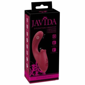 Der handlich leichte 3 Function Vibrator von Javida mit Stoß- und Klopf-Funktion verwöhnt innen und außen zugleich! Sein optimal gebogener Rillenschaft erreicht spielend leicht die G-Zone in der Vagina. Und stößt dort mit seiner prallen Vibro-Spitze immer wieder lustvoll zu. Gleichzeitig nimmt die softe, pochend-pulsierende Klopfkugel genau die Klitoris ins stimulierende Visier. Doppelt und dreifache Orgasmus-Power einfach per Knopfdruck!